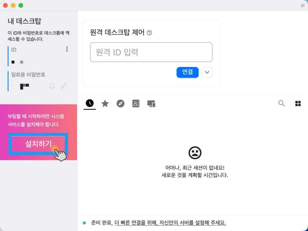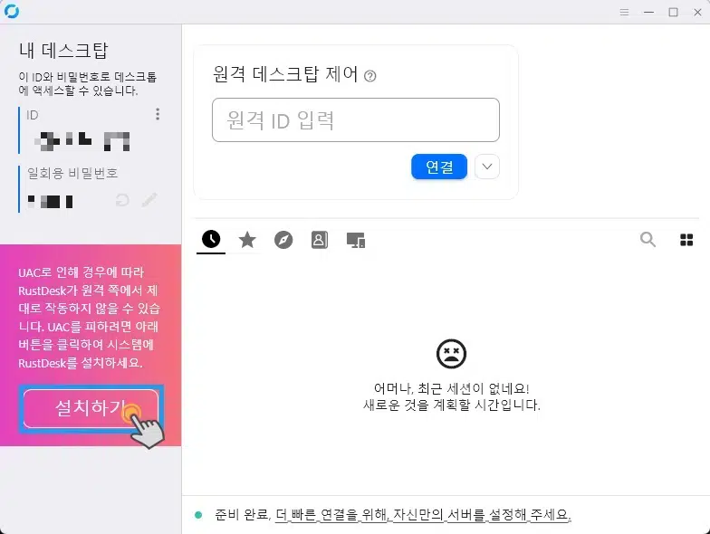 다운로드 받으신 RustDesk를 처음 실행시켜시면 좌 하단에 [설치하기 버튼을 클릭]합니다.
