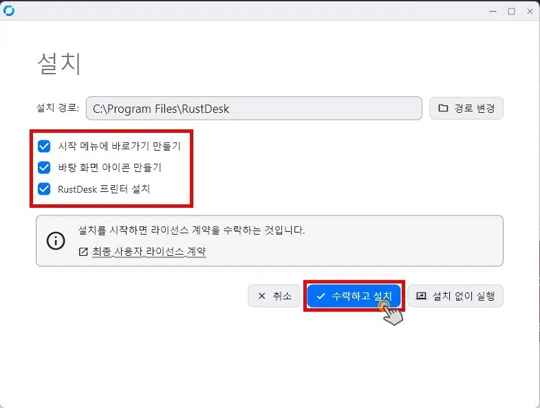 다음과 같은 설치 화면이 나오면 모든 체크박스를 체크해 주시고 [수락하고 설치] 버튼을 클릭합니다.