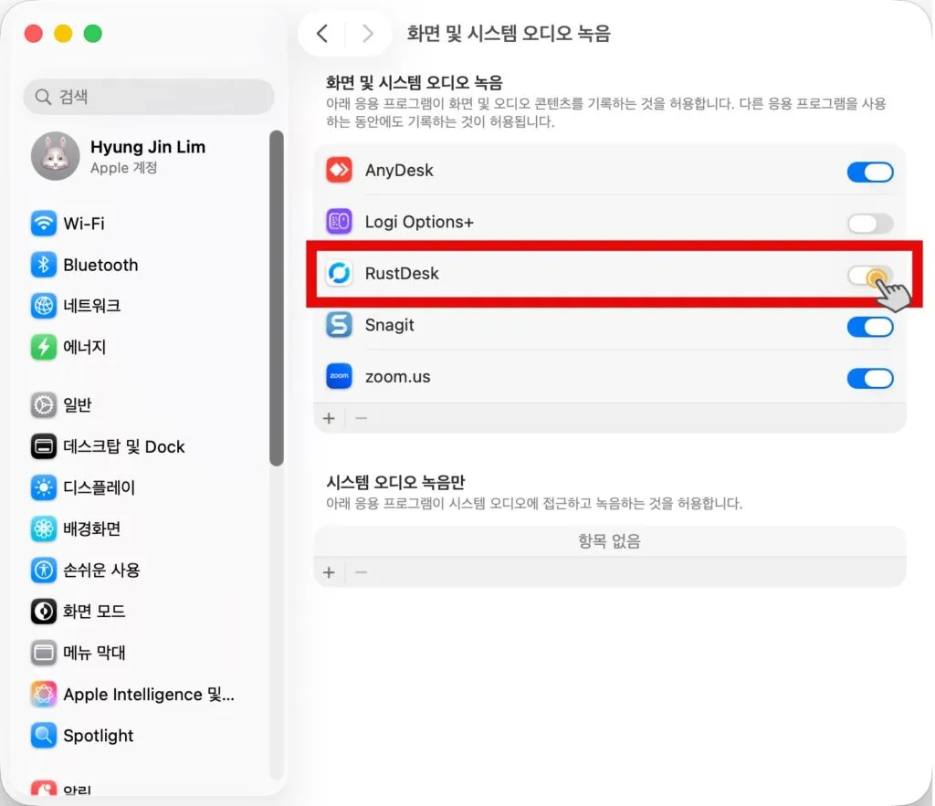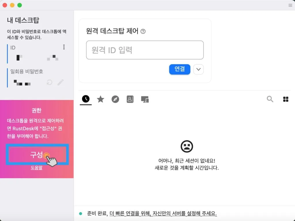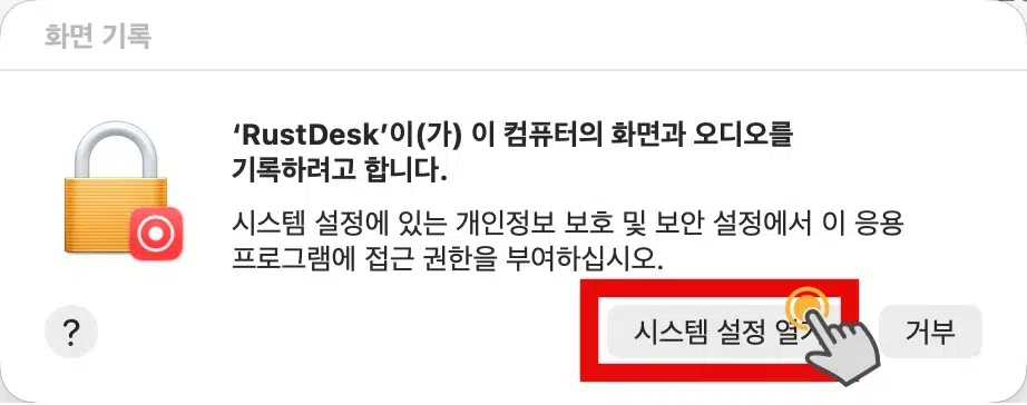 (2) 설치가 완료된 후 앱에서 RustDesk를 실행하면 다음과 같이 좌하단에 권한 관련 안내가 나와 있습니다. [구성]을 클릭해 주세요. 그 다음과 같은 화면 기록 팝업이 뜹니다. 여기서 [시스템 설정 열기]를 클릭하시고 화면 및 시스템 오디오 녹음란에서 RustDesk를 찾으시고 비활성화되어 있는 버튼을 클릭하여 활성화 시켜주세요.
