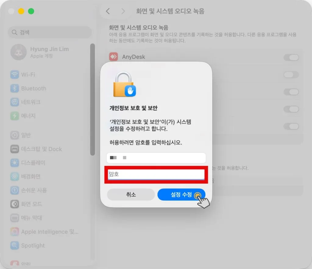(3) 개인정보 보호 및 보안 창이 뜨면 암호를 입력해 주시고 [설정 수정]버튼을 클릭, 저장해 주세요.