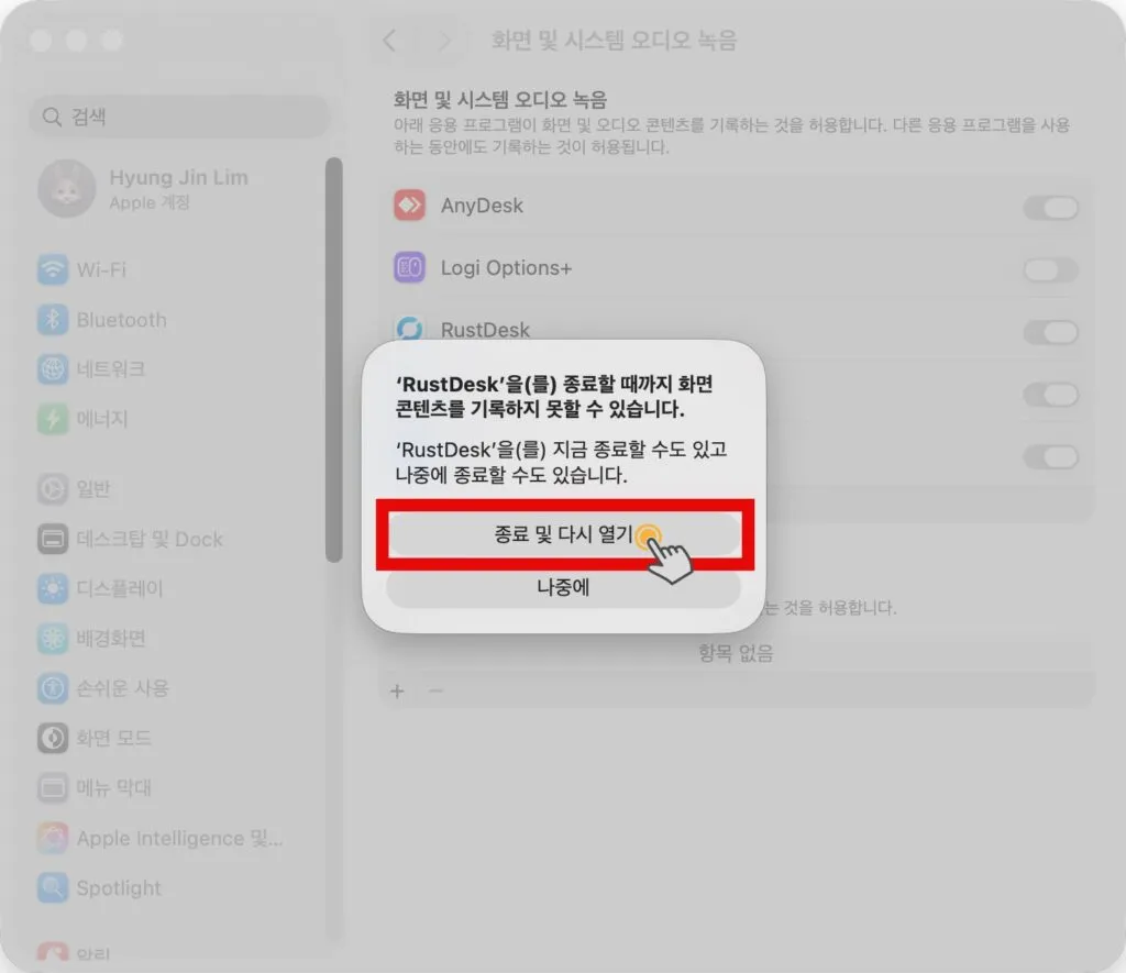 (4) 팝업 창이 뜨면 [종료 및 다시 열기]버튼을 클릭해 주시면 다시 RustDesk가 종료되었다가 다시 켜집니다.