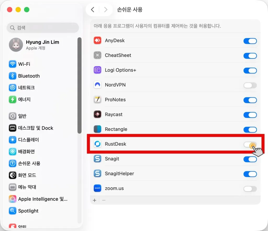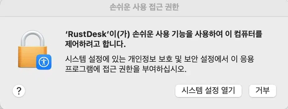 (5) 다시 켜지면(혹시 다시 안켜지면 앱 > RustDesk 를 실행해 주세요.) 좌 하단에 권한의 [구성] 클릭하세요. 손쉬운 사용 접근 권한 창이 켜지면 [시스템 설정 열기]를 클릭하시면 손쉬운 사용 창이 켜집니다. 여기서 RustDesk를 찾으시고 비활성화되어 있는 버튼을 클릭하여 활성화 시켜주세요.