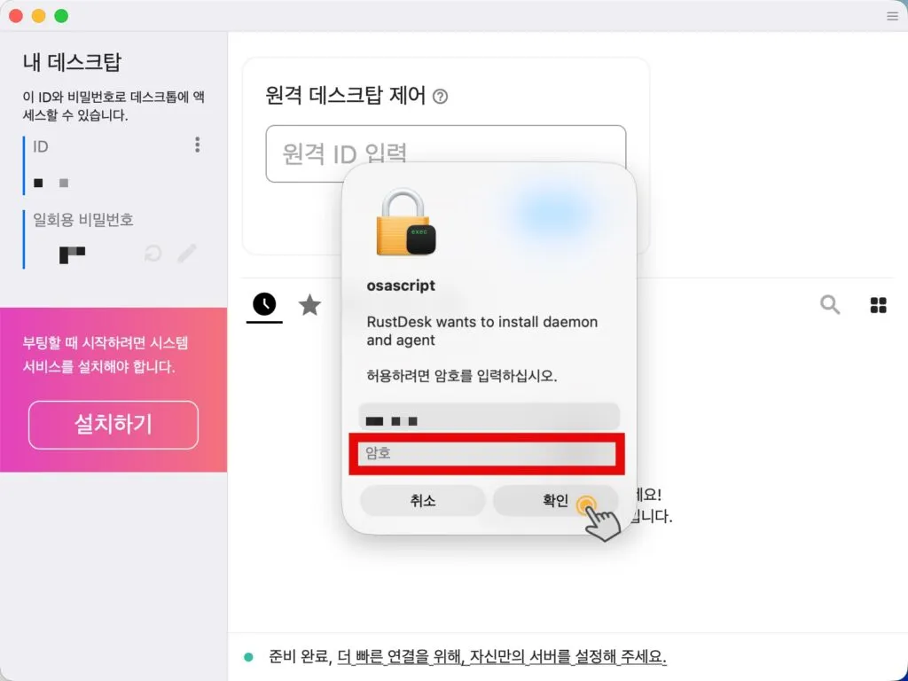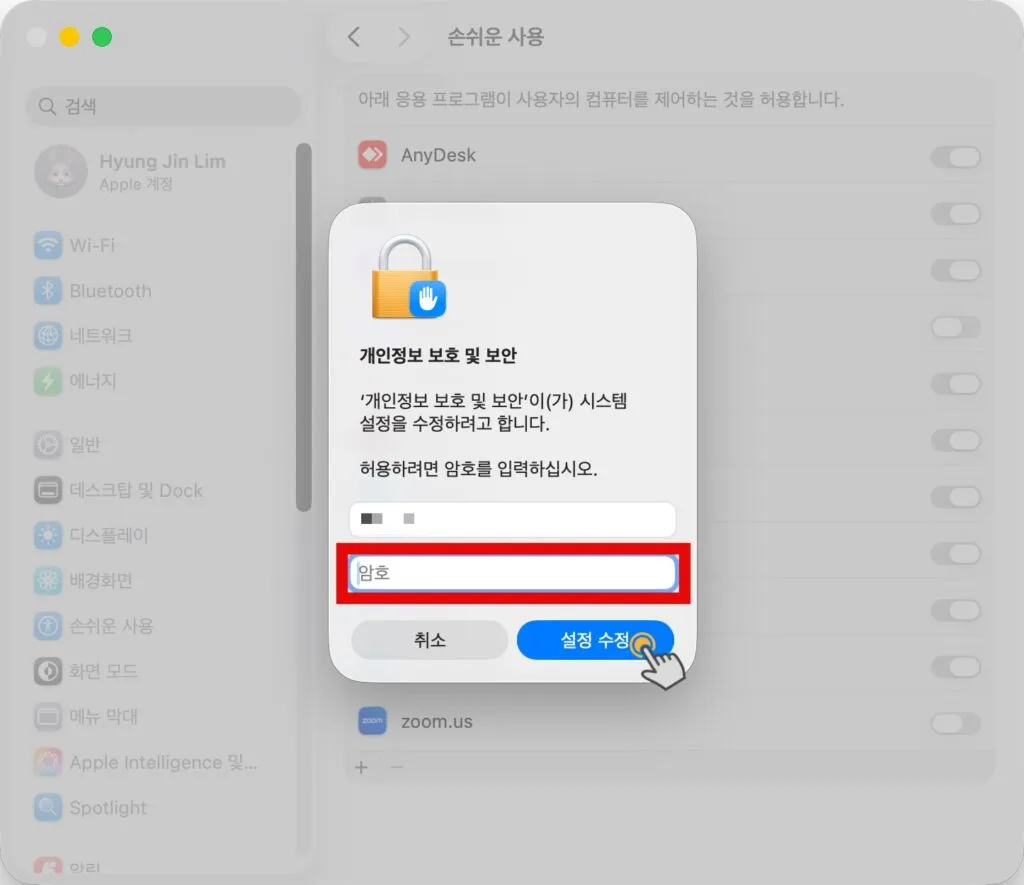 (8) osascript 팝업 창에서 암호를 입력하신 뒤 [확인] 버튼을 클릭합니다.