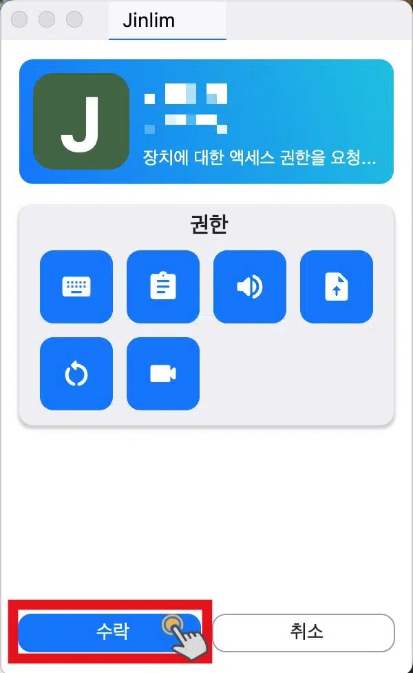 원격 시간에 맞춰 저희와 연락이 되면, 회원님의 PC에 접속하고, 이때 뜨는 다음과 같은 창에서 [수락]을 클릭해주시면 바로 원격 접속이 됩니다.